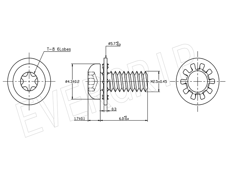 螺纹规格(thread) : M2.5 针穴(recess):梅花针(6 lobes) 材料( material):铁(steel C1022A) 表面处理(finish):三价黑锌 (black zinc CR3) 长度(lenght): 6 查看图面(drawing) 邮件咨询(inquire through email)