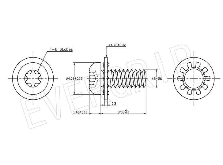 螺纹规格(thread) : #2-56 针穴(recess):梅花针(6 lobes) 材料( material):铁(steel C1022A) 表面处理(finish):三价黑锌 (black zinc CR3) 长度(lenght): 3/8 查看图面(drawing) 邮件咨询(inquire through email)